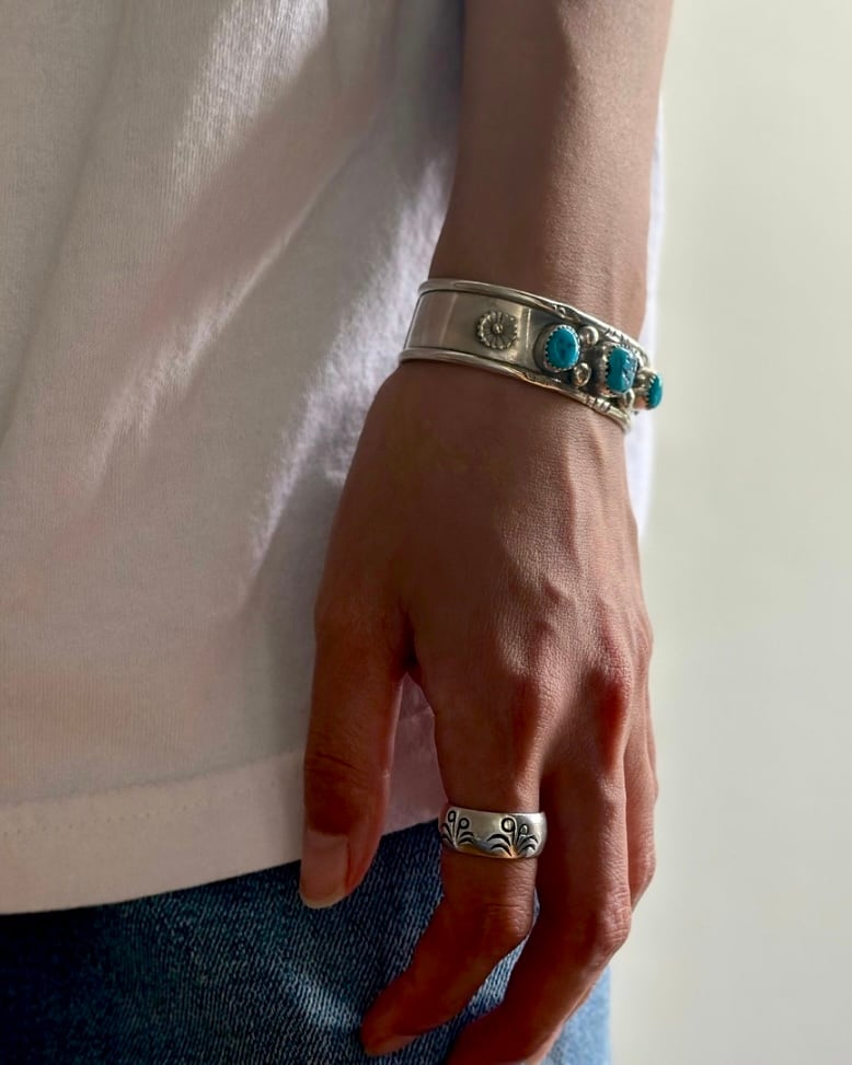 こちらはナバホ族特有のターコイズとスタンプワーク銀細工の