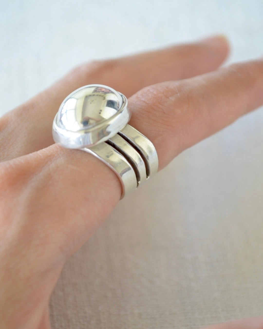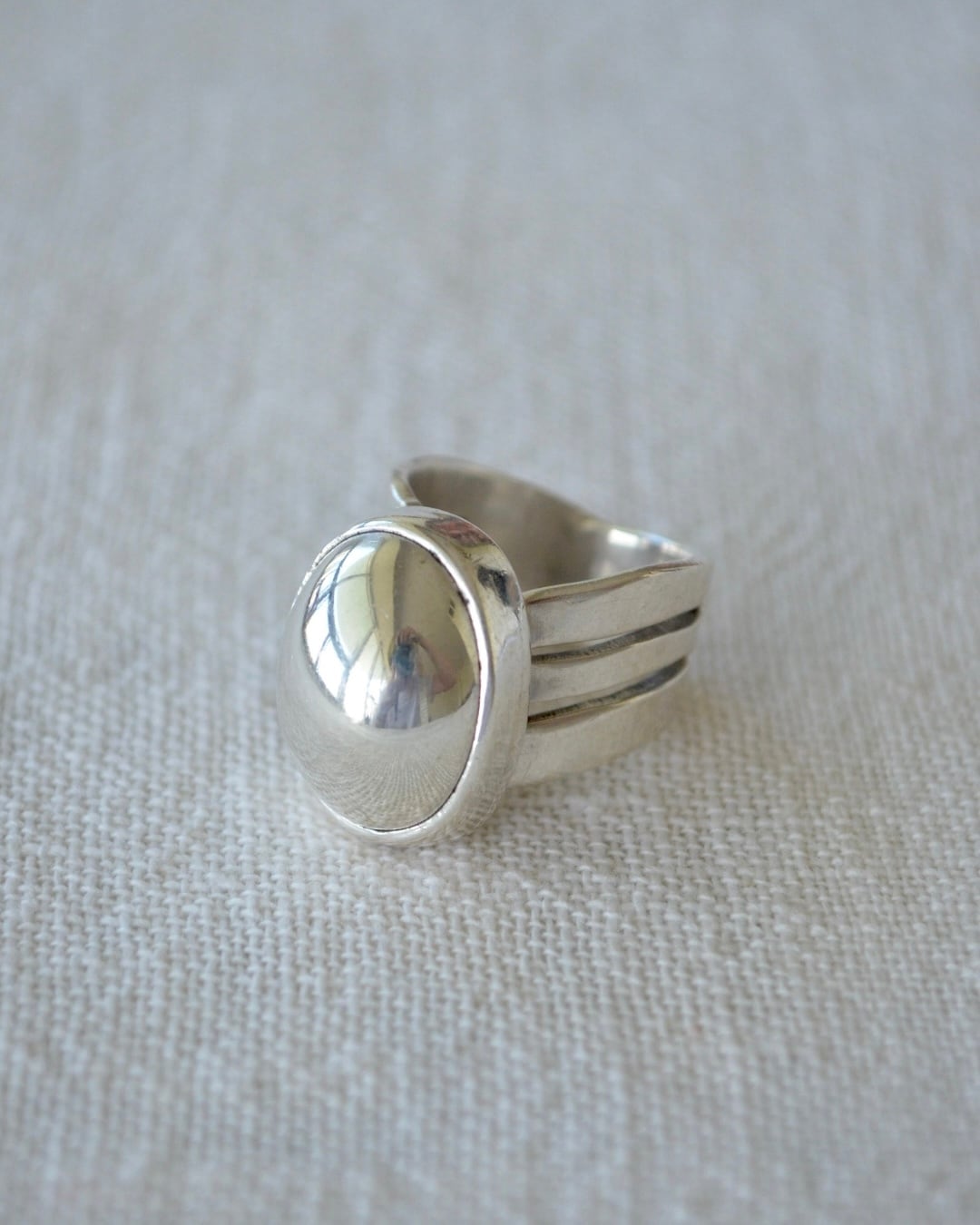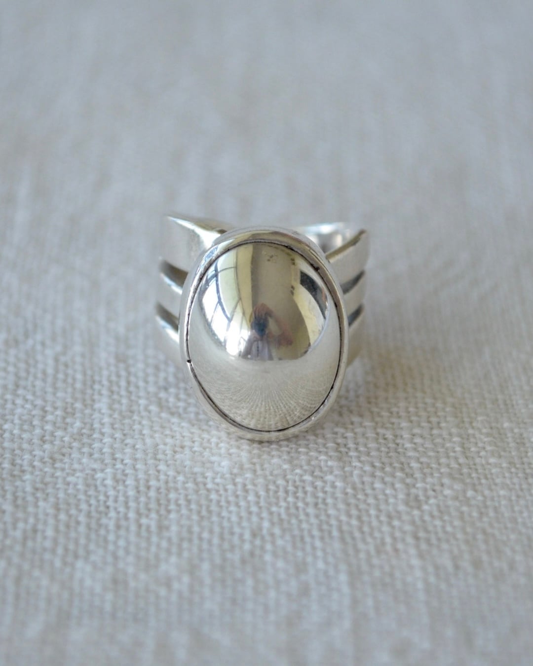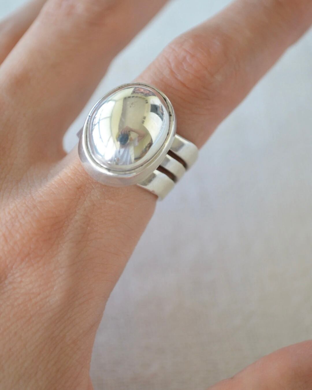 トップ部分にオーバル型モチーフのついたとても目に留まるリングです。