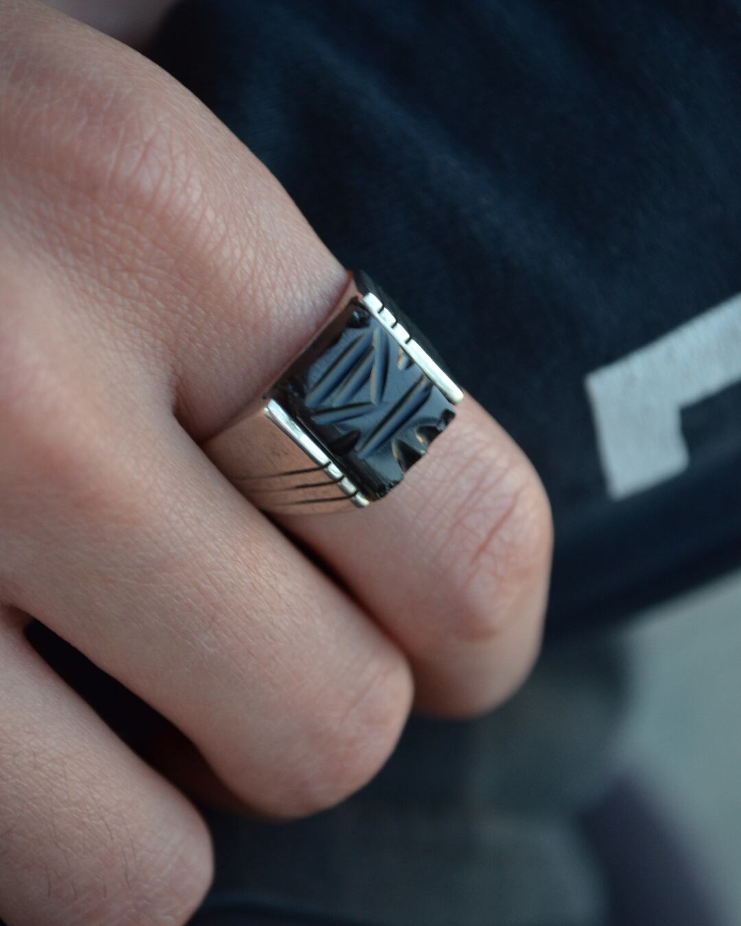 こちらはオブシディアンというオニキスによく似た素材で溶岩が固まってできた天然ガラスがつかわれており繊細な素材なため表面に数か所欠けが見られます。写真でご確認ください。