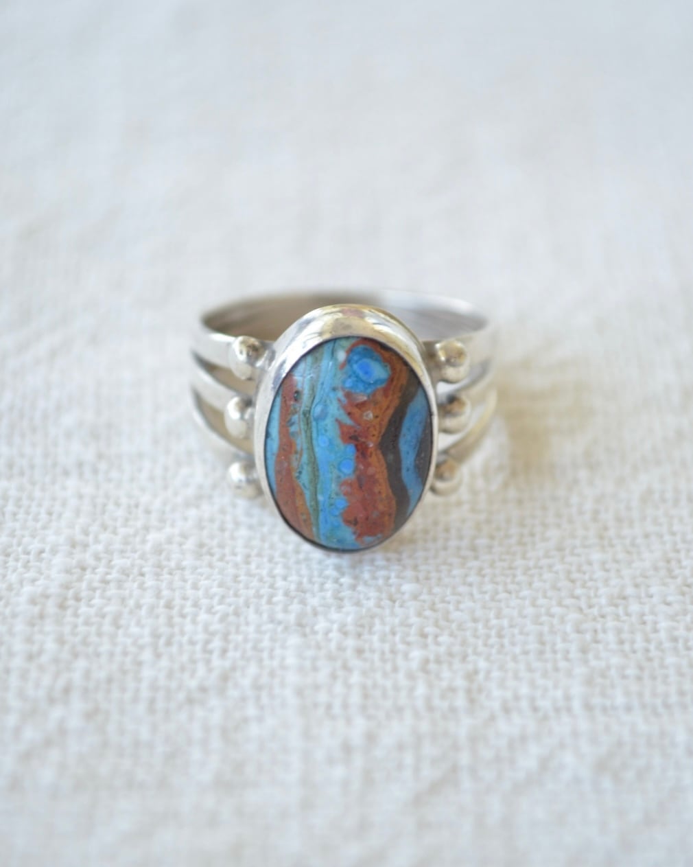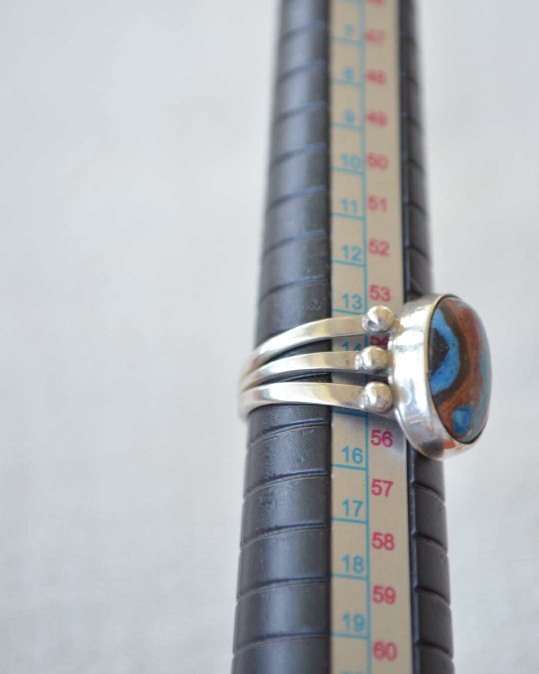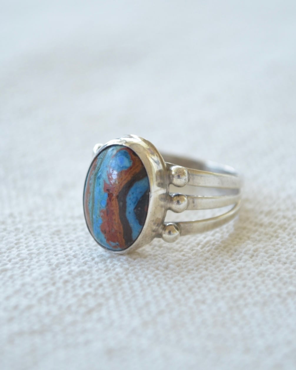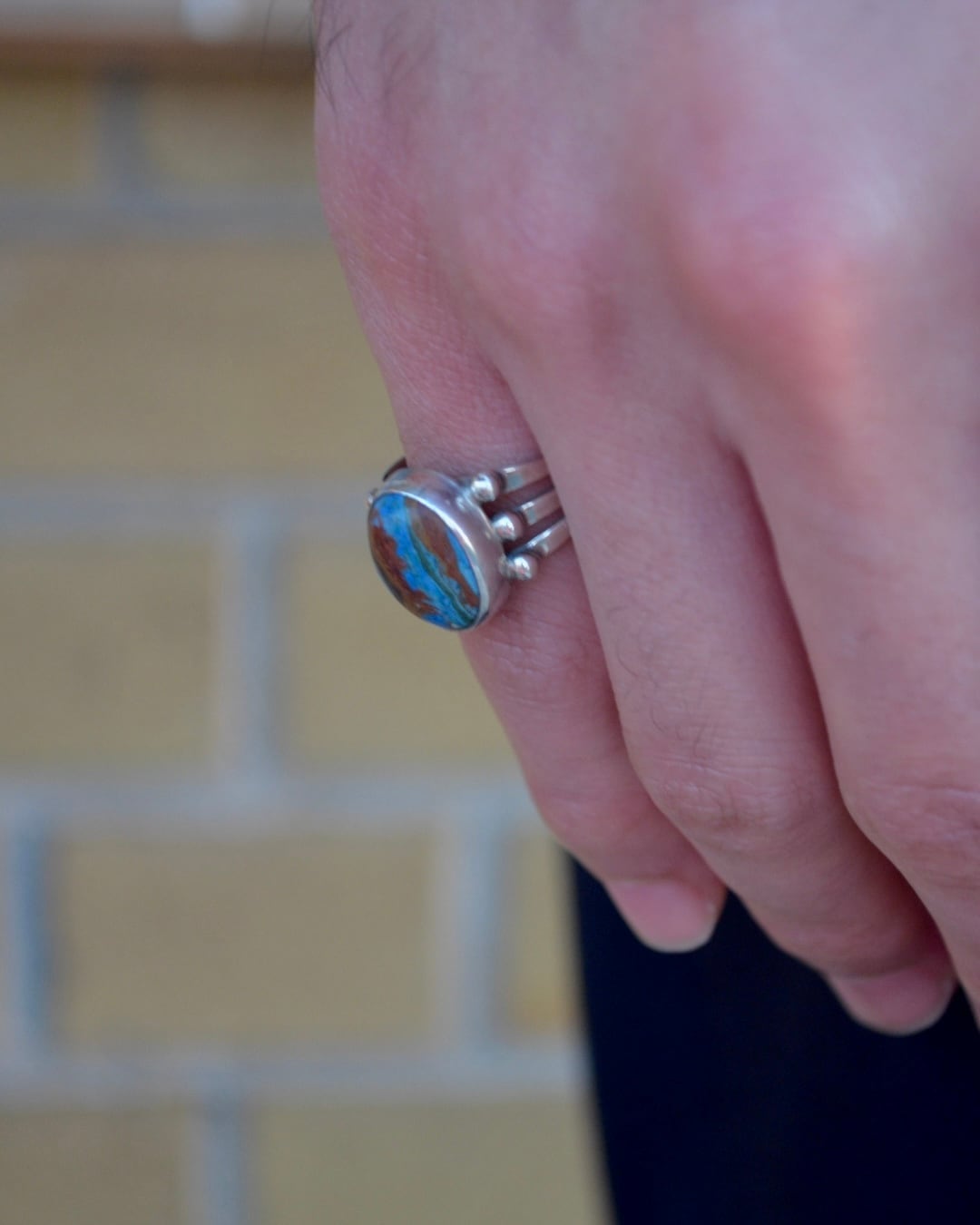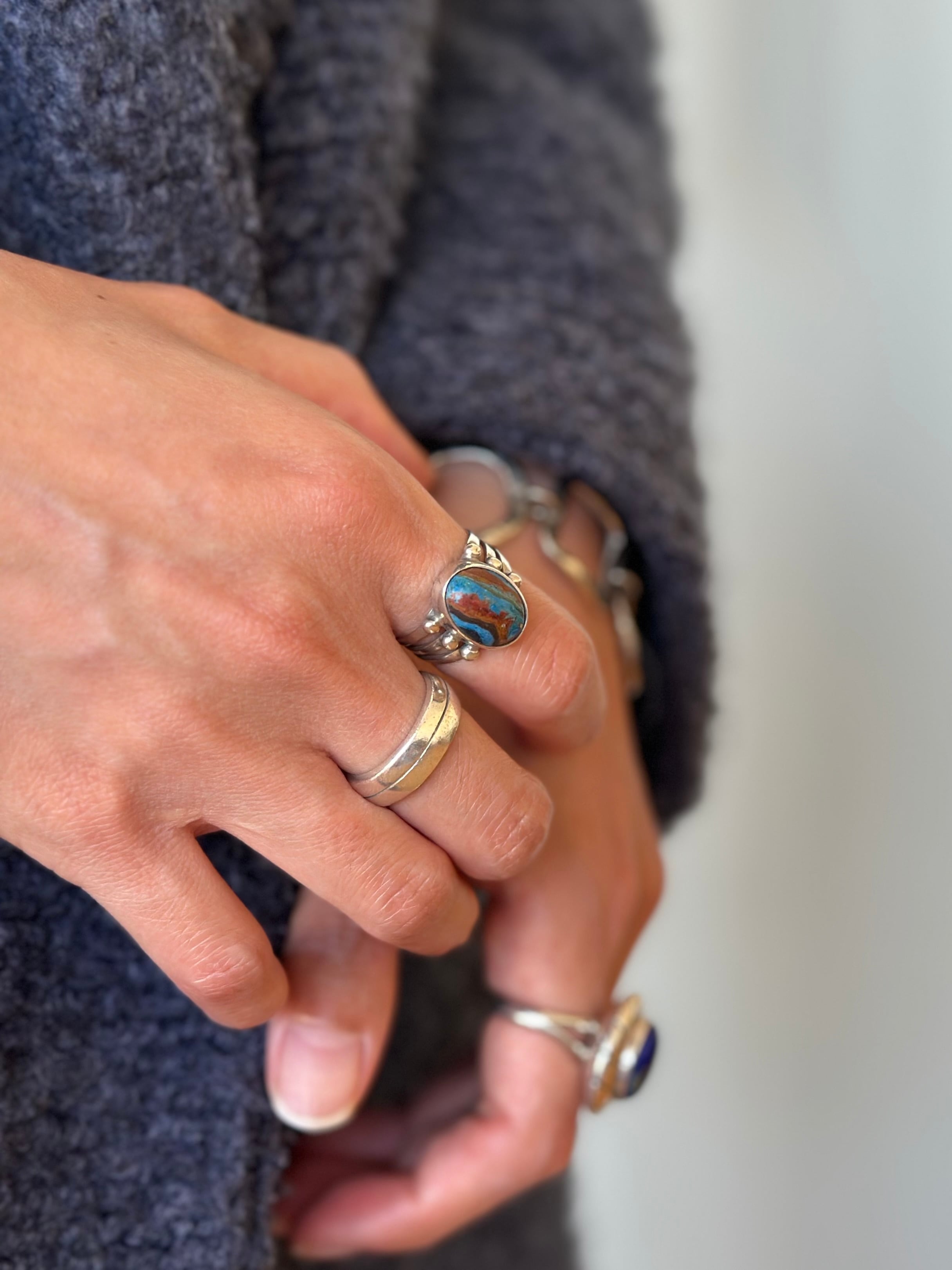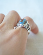 濃いめのブルーに宇宙のような神秘的デザインが目を引くリング。