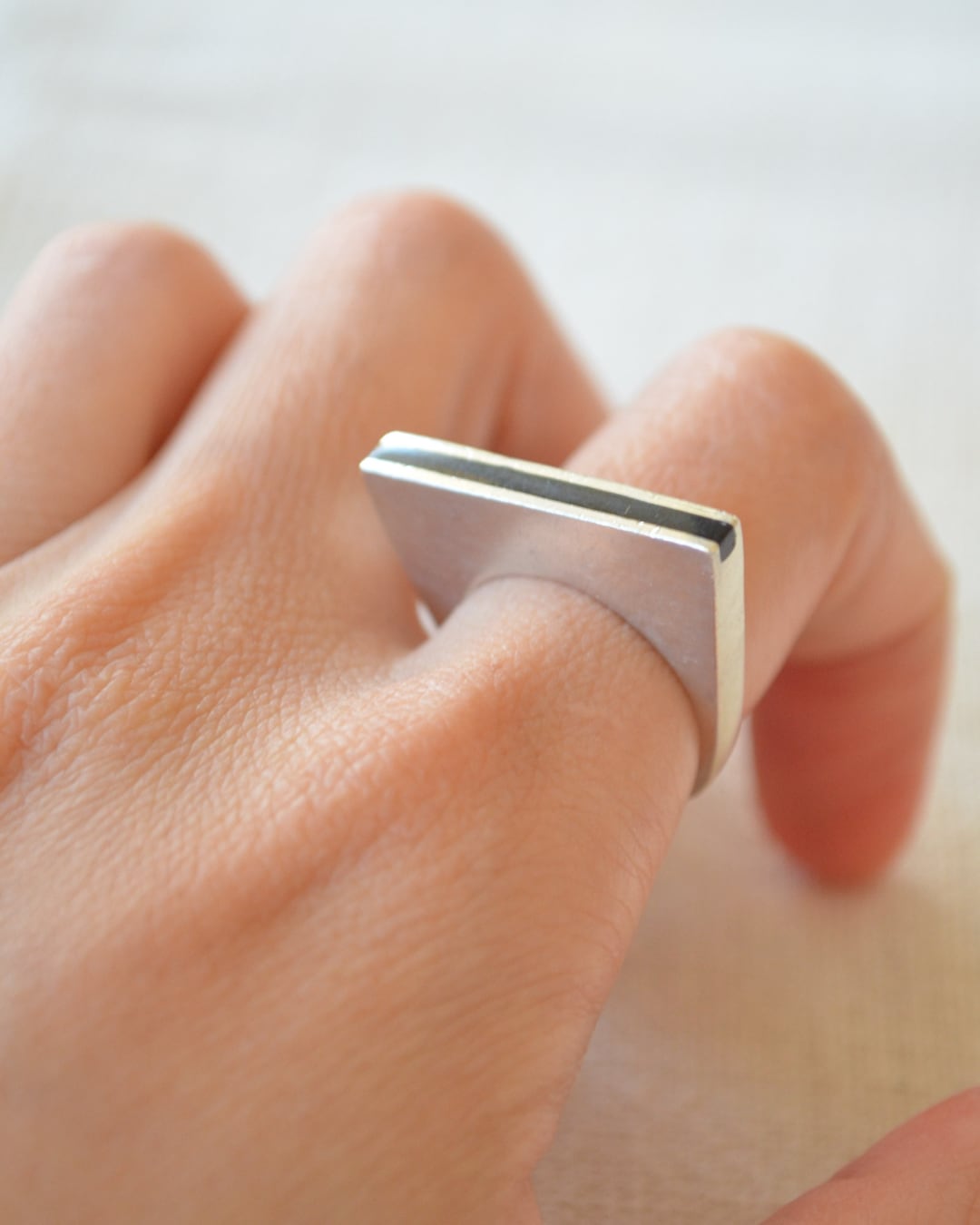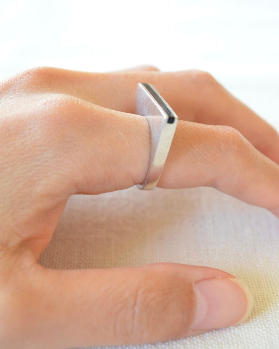 フロント部分がスクエアに角ばった厚みのあるデザインリング。