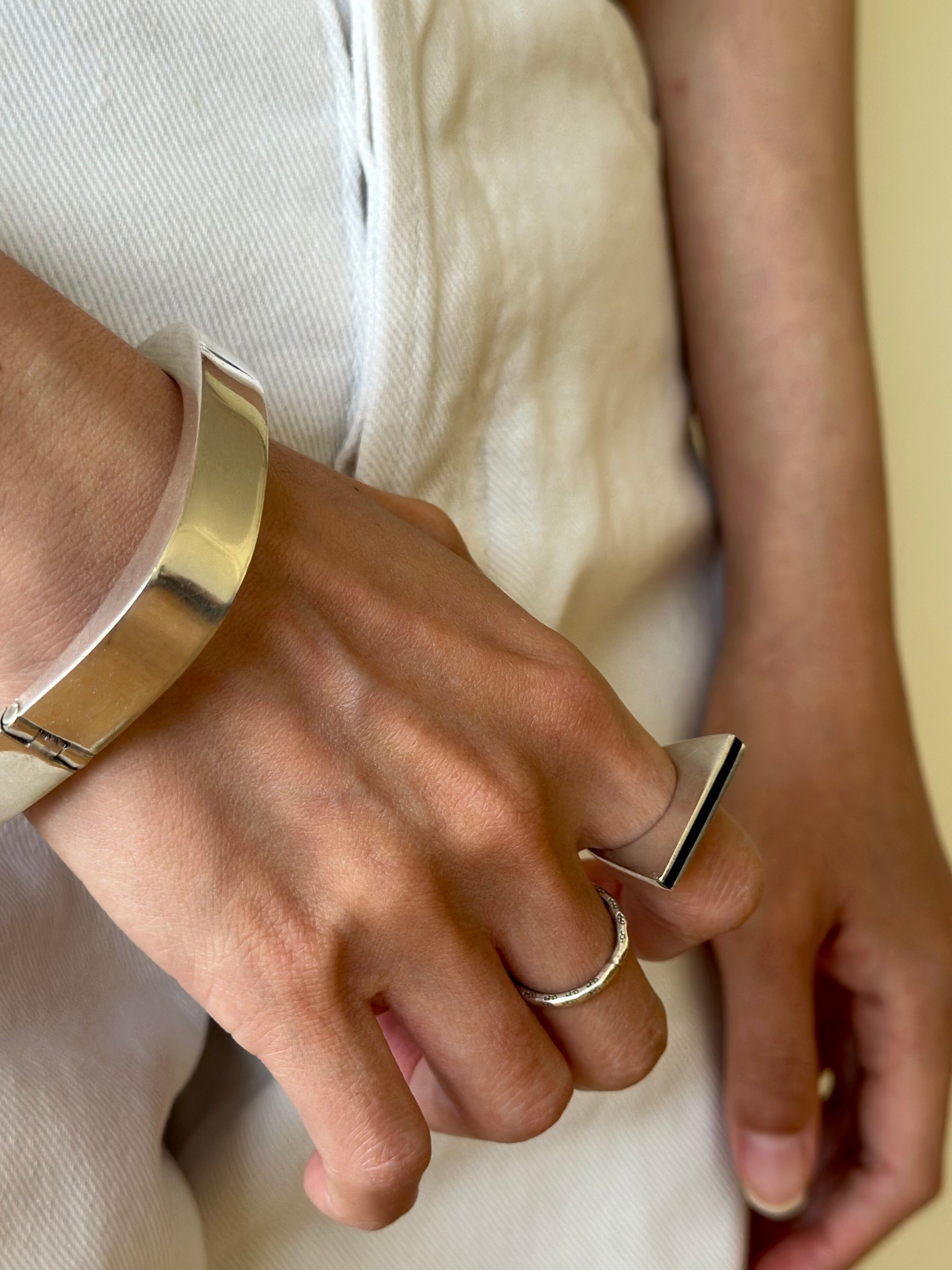 ソリッドシルバーで適度に重みも感じるリング、コーディネートのポイントとなるアイテムになる事間違いなしかと思います!